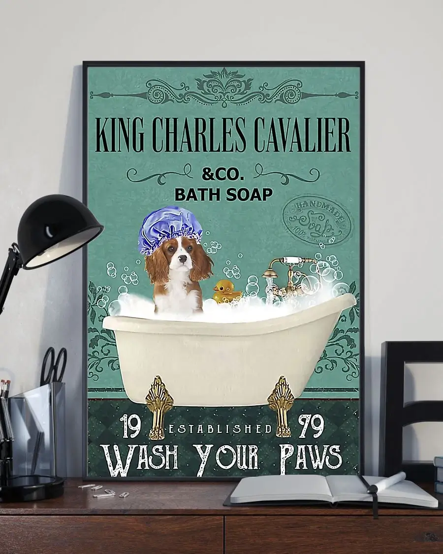 King Charles Cavalier And Co Bath Soap Wash Your Paws Blue Cap Dog Poster