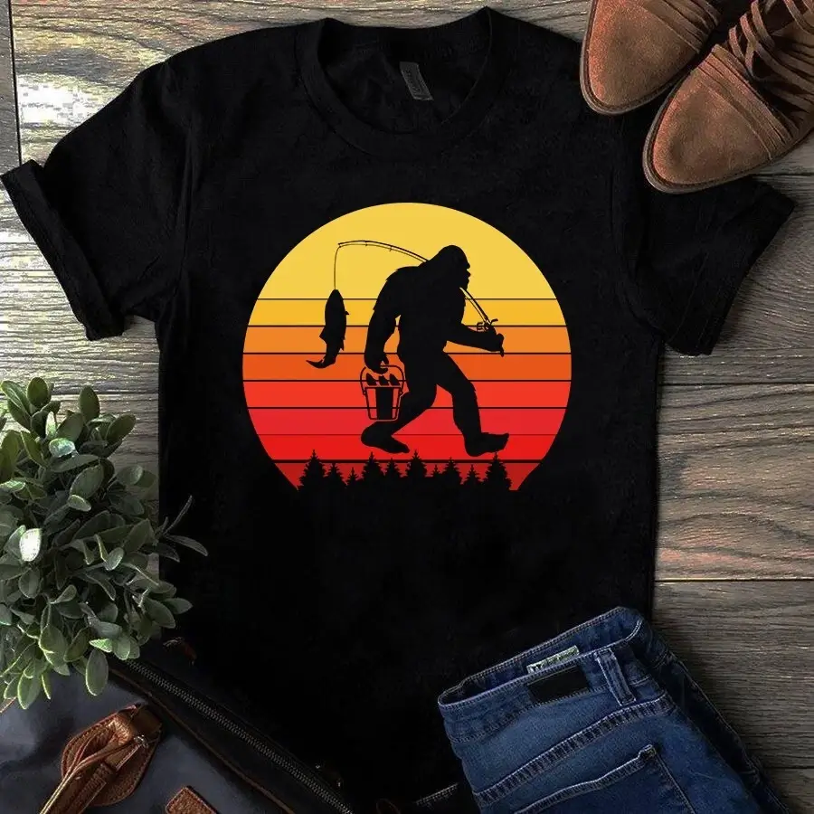 Retro Bigfoot Fishing Sasquatch Vintage Camping Gift Tshirt